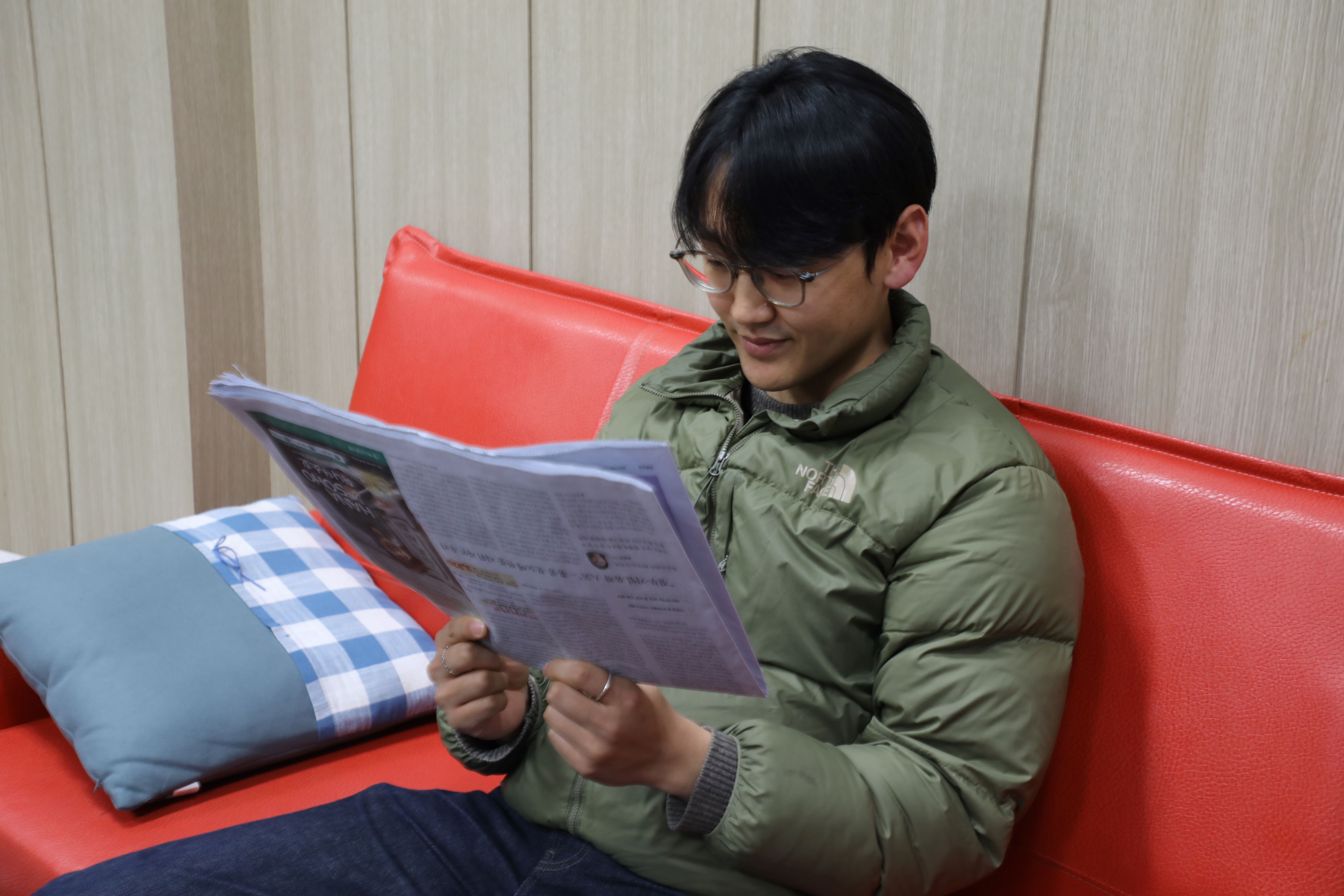๋ํ๊ต์์ ๊น์ฌ์ง ๊ธฐ์๊ฐ <๋จ๋น๋ค์ด๋ธ>์ ์ธํฐ๋ทฐ๋ฅผ ๋ง์น๊ณ ์์ธ๋ฅผ ์ทจํ๊ณ ์๋ค. ยฉ ์๋ํฐ ์ด๋ก๐ |